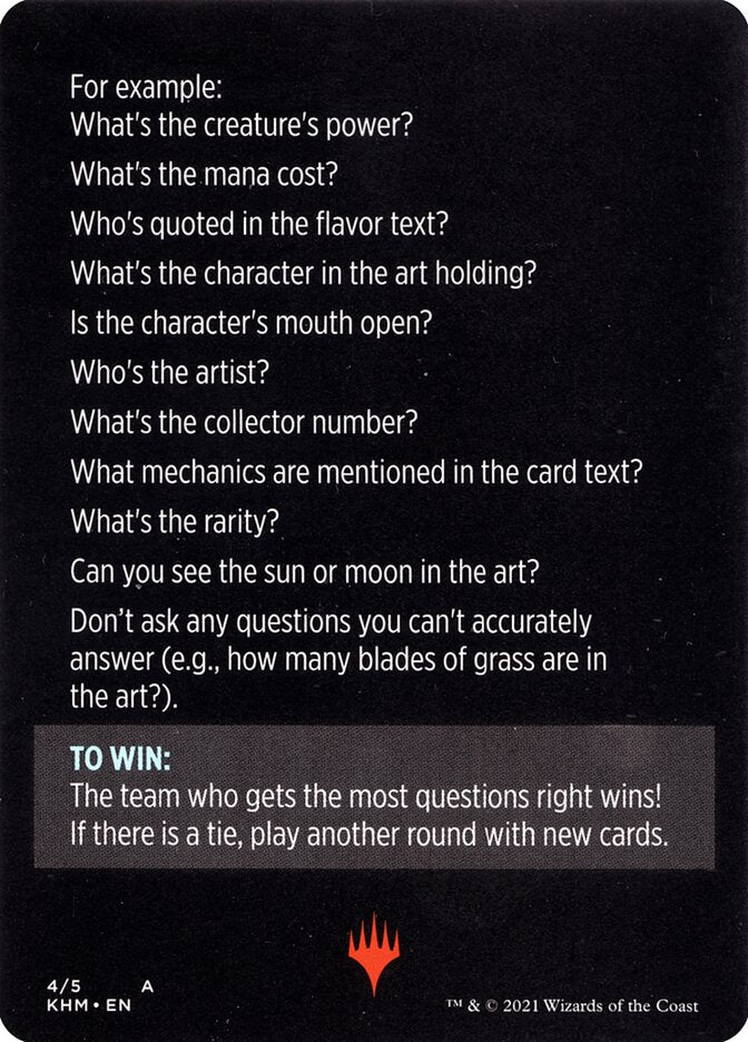 On your turn, your team has 30 seconds to examine your card before handing it over to the opposing team. Then they ask your team five questions about your card. Once you've answered them all, note your score. Now it's your team's turn to ask the questions! Questions can be about anything on the card.