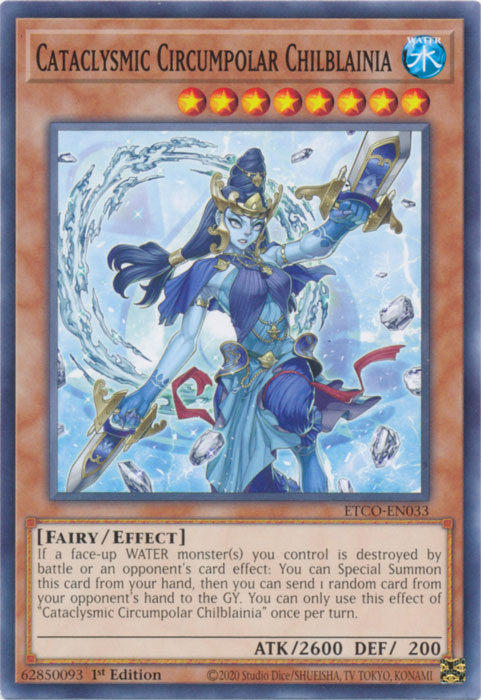 If a face-up WATER monster(s) you control is destroyed by battle or an opponent's card effect: You can Special Summon this card from your hand, then you can send 1 random card from your opponent's hand to the GY. You can only use this effect of "Cataclysmic Circumpolar Chilblainia" once per turn.