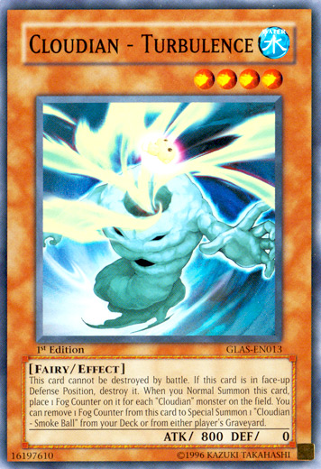 This card cannot be destroyed in battle. If this card is in face-up Defense Position, destroy it. When you Normal Summon this card, place 1 Fog Counter on it for each "Cloudian" monster on the field. You can remove 1 Fog Counter from this card to Special Summon 1 "Cloudian - Smoke Ball" from your Deck or from either player's Graveyard.