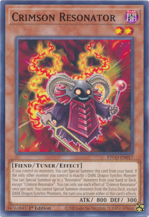If you control no monsters: You can Special Summon this card from your hand. If the only other monster you control is exactly 1 DARK Dragon Synchro Monster: You can Special Summon up to 2 "Resonator" monsters from your hand or Deck, except "Crimson Resonator". You can only use each effect of "Crimson Resonator" once per turn. You cannot Special Summon monsters from the Extra Deck, except DARK Dragon Synchro Monsters, the turn you activate either of this card's effects.