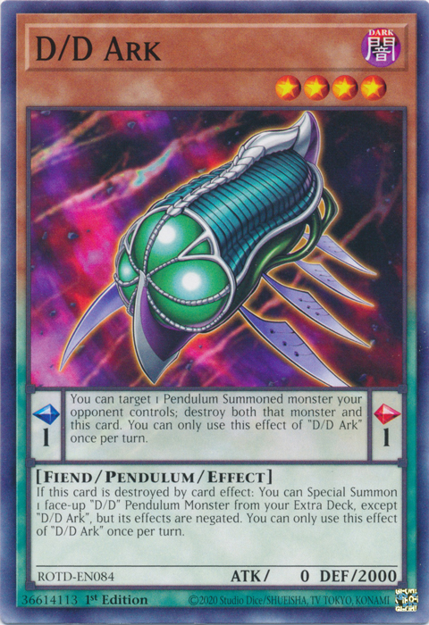 If this card is destroyed by card effect: You can Special Summon 1 face-up "D/D" Pendulum Monster from your Extra Deck, except "D/D Ark", but its effects are negated. You can only use this effect of "D/D Ark" once per turn.