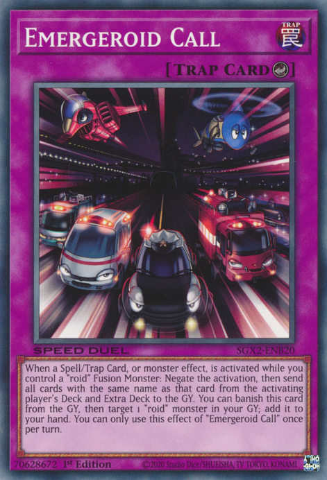 When a Spell/Trap Card, or monster effect, is activated while you control a "roid" Fusion Monster: Negate the activation, then send all cards with the same name as that card from the activating player's Deck and Extra Deck to the GY. You can banish this card from the GY, then target 1 "roid" monster in your GY; add it to your hand. You can only use this effect of "Emergeroid Call" once per turn.