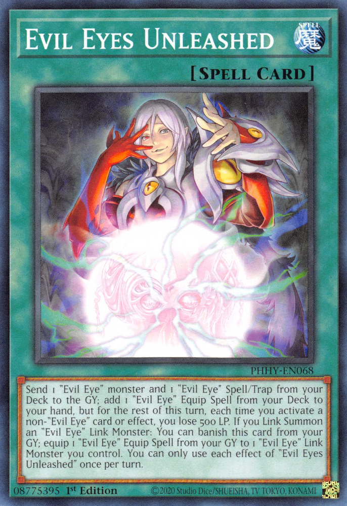 Send 1 "Evil Eye" monster and 1 "Evil Eye" Spell/Trap from your Deck to the GY; add 1 "Evil Eye" Equip Spell from your Deck to your hand, but for the rest of this turn, each time you activate a non-"Evil Eye" card or effect, you lose 500 LP. If you Link Summon an "Evil Eye" monster: You can banish this card from your GY; equip 1 "Evil Eye" Equip Spell from your GY to 1 "Evil Eye" Link Monster you control. You can only use each effect of "Evil Eyes Unleashed" once per turn.