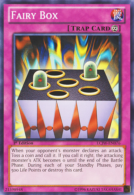 Each time a monster your opponent controls attacks, toss a coin and call Heads or Tails. If you call it right, the attacking monster's ATK becomes 0 during the Battle Phase only. During each of your Standby Phases, pay 500 Life Points or destroy this card.