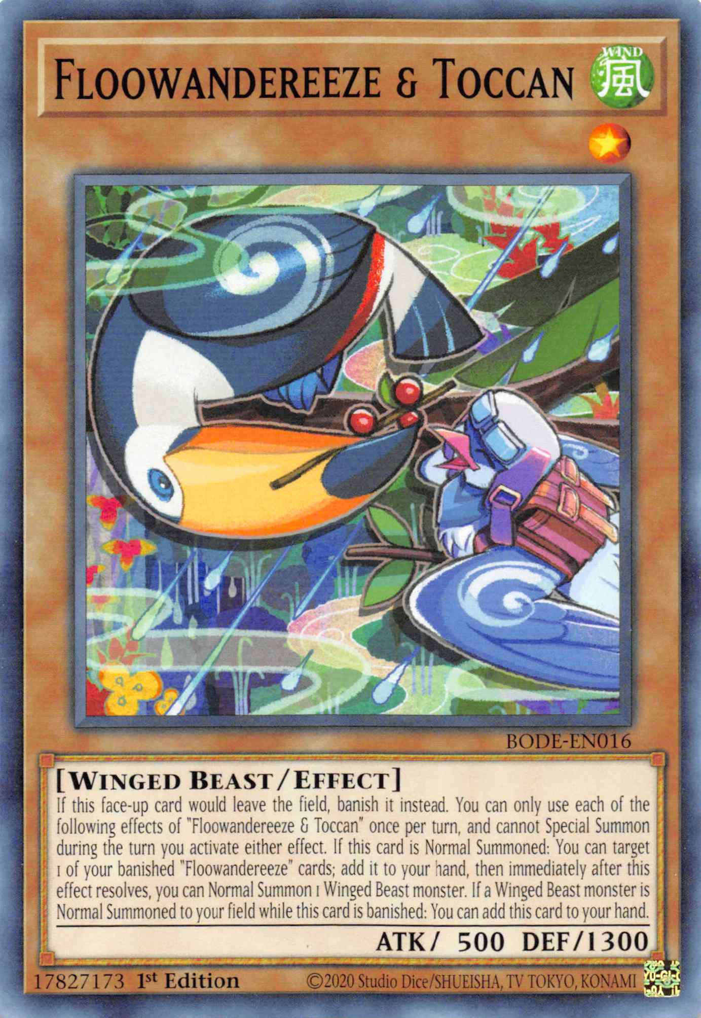 If this face-up card would leave the field, banish it instead. You can only use each of the following effects of "Floowandereeze & Toccan" once per turn, and cannot Special Summon during the turn you activate either effect. If this card is Normal Summoned: You can target 1 of your banished "Floowandereeze" cards; add it to your hand, then immediately after this effect resolves, you can Normal Summon 1 Winged Beast monster. If a Winged Beast monster is Normal Summoned to your field while this card is banished: You can add this card to your hand.