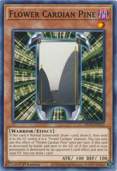 If this card is Normal Summoned: Draw 1 card, show it, then send it to the GY unless it is a "Flower Cardian" monster. You can only use this effect of "Flower Cardian Pine" once per turn. If this card is destroyed by battle and sent to the GY, or if this card in your possession is destroyed by an opponent's card effect and sent to your GY: You can draw 1 card.