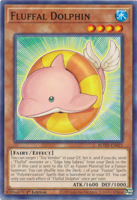 You can target 1 "Toy Vendor" in your GY; Set it, and if you do, send 1 "Fluffal" monster or 1 "Edge Imp Sabres" from your Deck to the GY. If this card is sent to the GY as Fusion Material for a Fusion Summon: You can shuffle into the Deck, 1 of your "Fusion" Spells or "Polymerization" Spells that is banished or in your GY. You can only use each effect of "Fluffal Dolphin" once per turn.