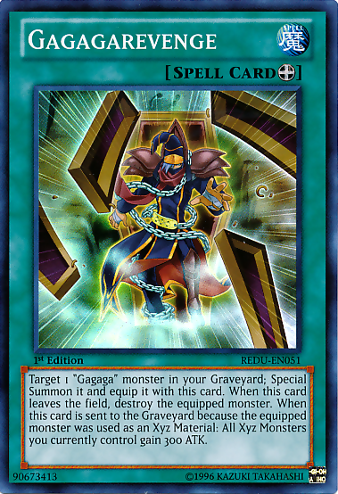Target 1 "Gagaga" monster in your Graveyard; Special Summon it and equip it with this card. When this card leaves the field, destroy the equipped monster. When this card is sent to the Graveyard because the equipped monster was used as an Xyz Material: All Xyz Monsters you currently controls gain 300 ATK.