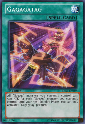 All "Gagaga" monsters you currently control gain 500 ATK for each "Gagaga" monster you currently control, until your next Standby Phase. You can only activate 1 "Gagagatag" per turn.