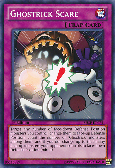 Target any number of face-down Defense Position monsters you control; change them to face-up Defense Position, count the number of "Ghostrick" monsters among them, and if you do, change up to that many face-up monsters your opponent controls to face-down Defense Position (min. 1).