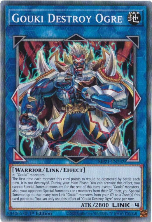 The first time each monster this card points to would be destroyed by battle each turn, it is not destroyed. During your Main Phase: You can activate this effect; you cannot Special Summon monsters for the rest of this turn, except "Gouki" monsters, also, your opponent Special Summons 1 or 2 monsters from their GY, then, you Special Summon up to that many non-Link "Gouki" monsters from your GY to a Zone(s) this card points to. You can only use this effect of "Gouki Destroy Ogre" once per turn.