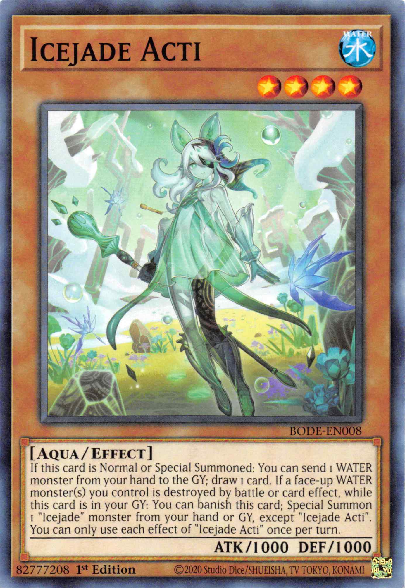 If this card is Normal or Special Summoned: You can send 1 WATER monster from your hand to the GY; draw 1 card. If a face-up WATER monster(s) you control is destroyed by battle or card effect, while this card is in your GY: You can banish this card; Special Summon 1 "Icejade" monster from your hand or GY, except "Icejade Acti". You can only use each effect of "Icejade Acti" once per turn.