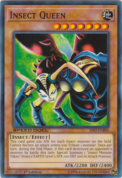This card gains 200 ATK for each Insect monster on the field. Cannot declare an attack unless you Tribute 1 monster. Once per turn, during the End Phase, if this card destroyed an opponent's monster by battle this turn: Special Summon 1 "Insect Monster Token" (Insect/EARTH/Level 1/ATK 100/DEF 100) in Attack Position.
