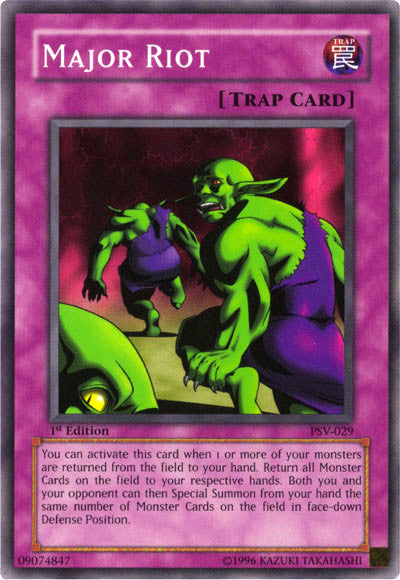 You can activate this card when 1 or more of your monsters are returned from the field to your hand. Return all Monster Cards on the field to your respective hands. Both you and your opponent can then Special Summon from your hand the same number of Monster Cards on the field in face-down Defense Position.