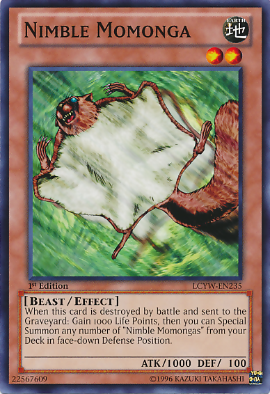 When this card is destroyed by battle and sent to the Graveyard: Gain 1000 Life Points then you can also Special Summon any number of "Nimble Momongas" from your Deck in face-down Defense Position.