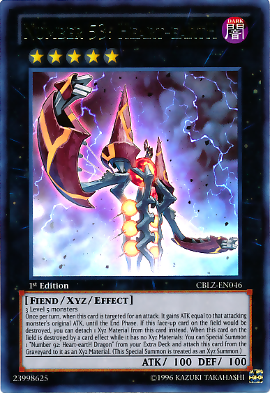 Once per turn, when this card is targeted for an attack: It gains ATK equal to that attacking monster's original ATK, until the End Phase. If this face-up card on the field would be destroyed, you can detach 1 Xyz Material from this card instead. When this card on the field is destroyed by a card effect while it has no Xyz Materials: You can Special Summon 1 "Number 92: Heart-eartH Dragon" from your Extra Deck and attach this card from the Graveyard to it as an Xyz Material. (This Special Summon is treated as an Xyz Summon.)