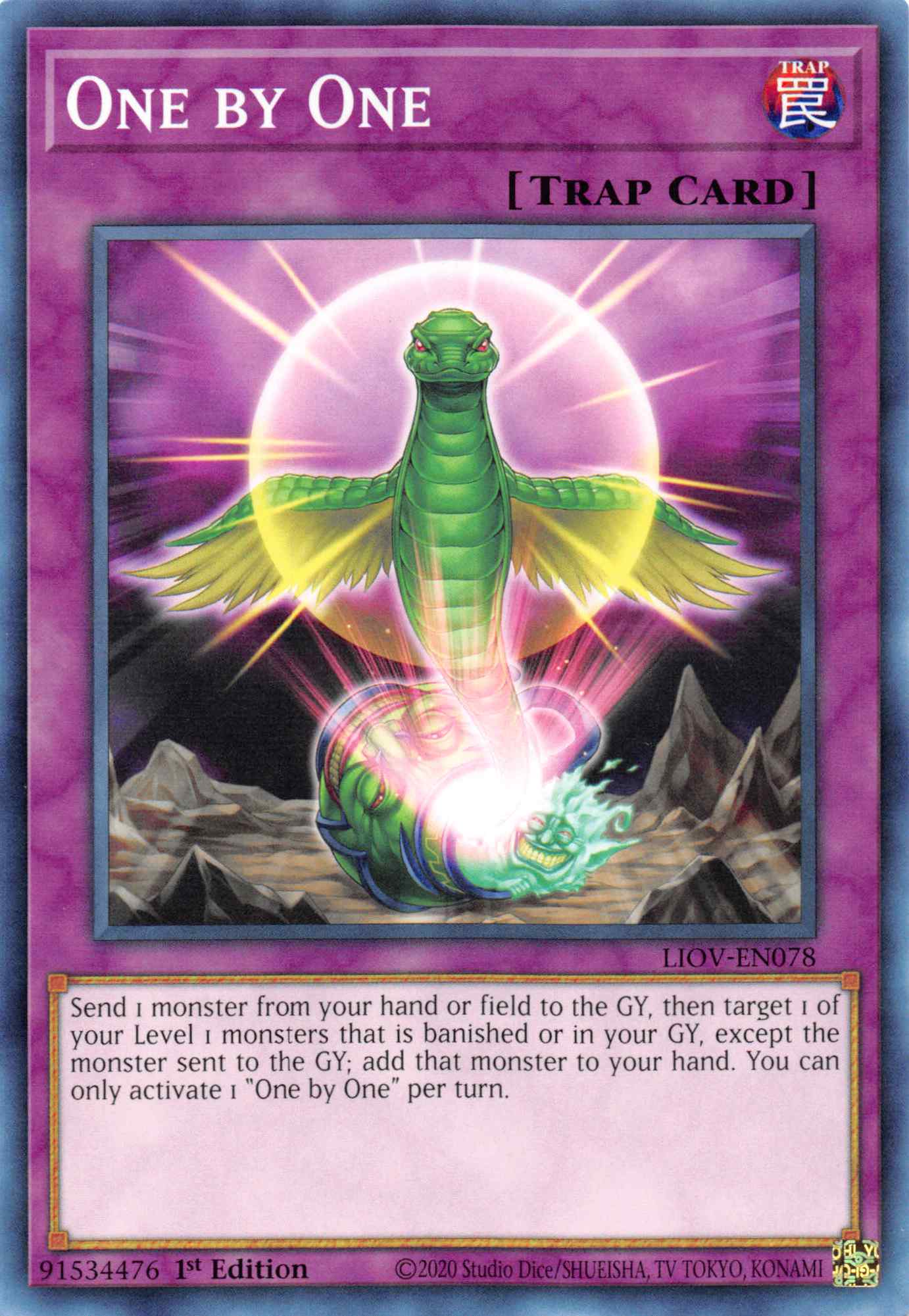 Send 1 monster from your hand or field to the GY, then target 1 of your Level 1 monsters that is banished or in your GY, except the monster sent to the GY; add that monster to your hand. You can only activate 1 "One by One" per turn.
