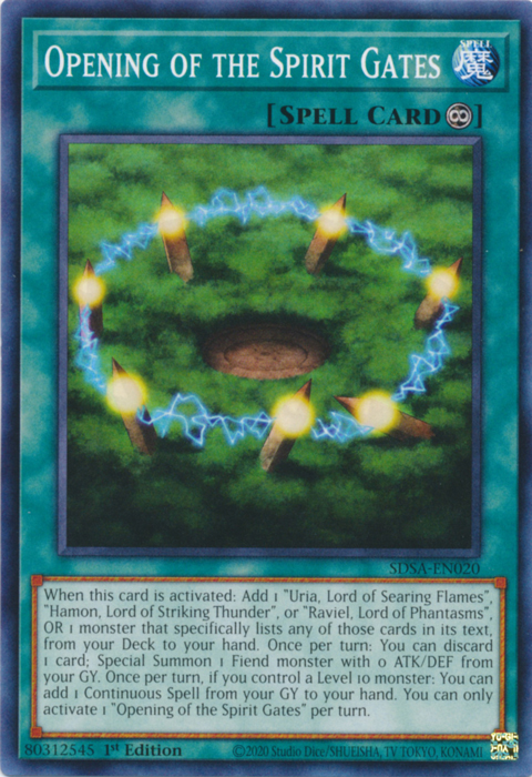 When this card is activated: Add 1 "Uria, Lord of Searing Flames", "Hamon, Lord of Striking Thunder", or "Raviel, Lord of Phantasms", OR 1 monster that specifically lists any of those cards in its text, from your Deck to your hand. Once per turn: You can discard 1 card; Special Summon 1 Fiend monster with 0 ATK/DEF from your GY. Once per turn, if you control a Level 10 monster: You can add 1 Continuous Spell from your GY to your hand. You can only activate 1 "Opening of the Spirit Gates" per turn.