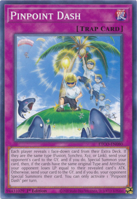 Each player reveals 1 face-down card from their Extra Deck. If they are the same type (Fusion, Synchro, Xyz, or Link), send your opponent's card to the GY, and if you do, Special Summon your card, then, if the cards have the same original Type and Attribute, your opponent loses LP equal to their revealed card's ATK. Otherwise, send your card to the GY, and if you do, your opponent Special Summons their card. You can only activate 1 "Pinpoint Dash" per turn.