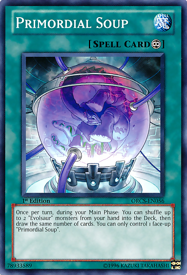 Once per turn, during your Main Phase: You can shuffle up to 2 "Evolsaur" monsters from your hand into the Deck, then draw the same number of cards. You can only control 1 face-up "Primordial Soup".