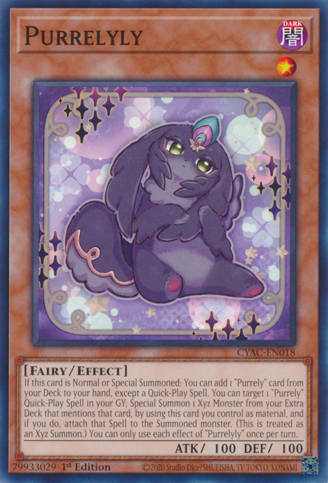 If this card is Normal or Special Summoned: You can add 1 "Purrely" card from your Deck to your hand, except a Quick-Play Spell. You can target 1 "Purrely" Quick-Play Spell in your GY; Special Summon 1 Xyz Monster from your Extra Deck that mentions that card, by using this card you control as material, and if you do, attach that Spell to the Summoned monster. (This is treated as an Xyz Summon.) You can only use each effect of "Purrelyly" once per turn.