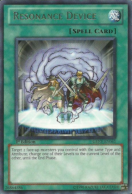 Target 2 face-up monsters you control with the same Type and Attribute; change one of tjeir Levels to the current Level of the other, until the End Phase.