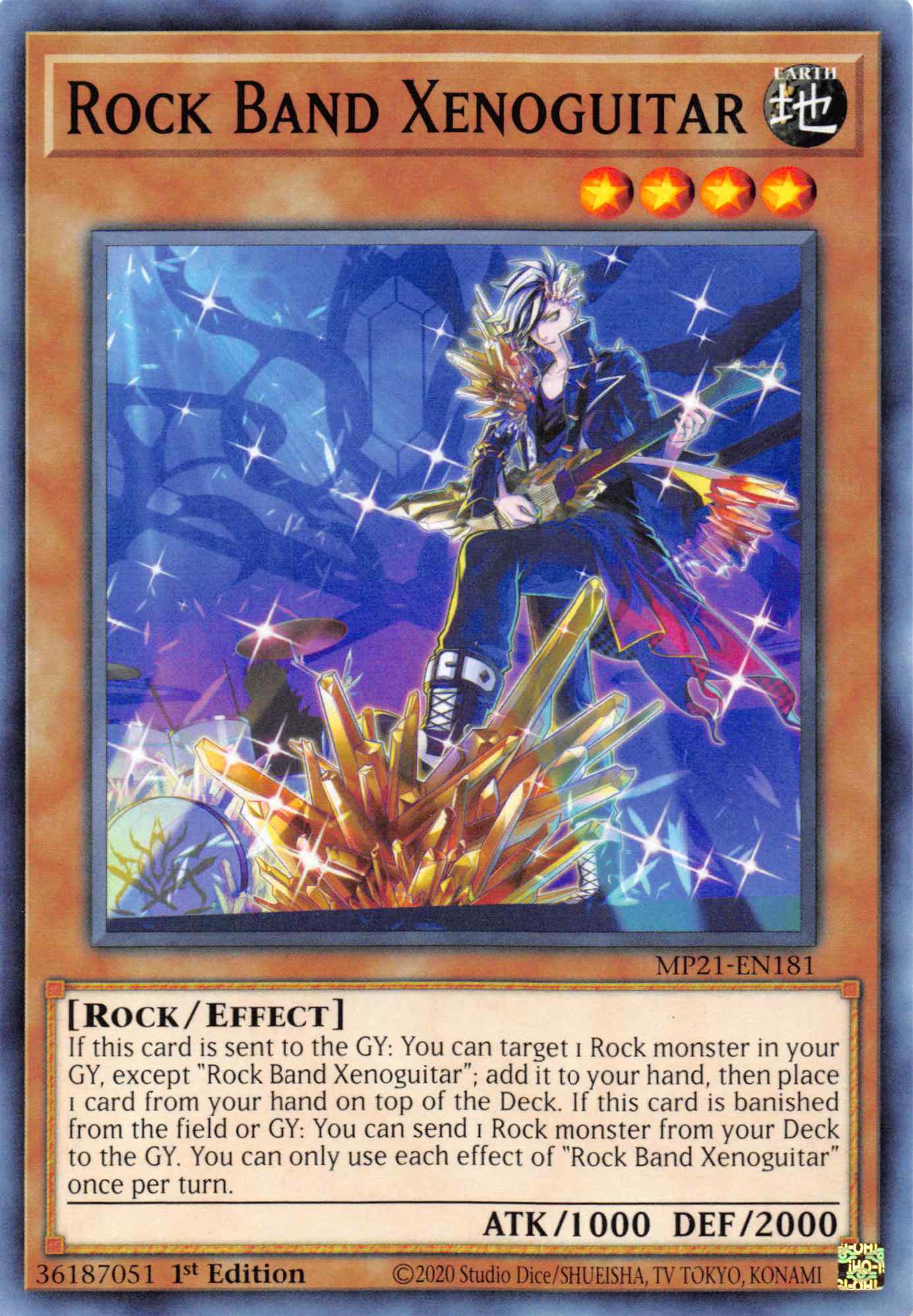 If this card is sent to the GY: You can target 1 Rock monster in your GY, except "Rock Band Xenoguitar"; add it to your hand, then place 1 card from your hand on top of the Deck. If this card is banished from the field or GY: You can send 1 Rock monster from your Deck to the GY. You can only use each effect of "Rock Band Xenoguitar" once per turn.