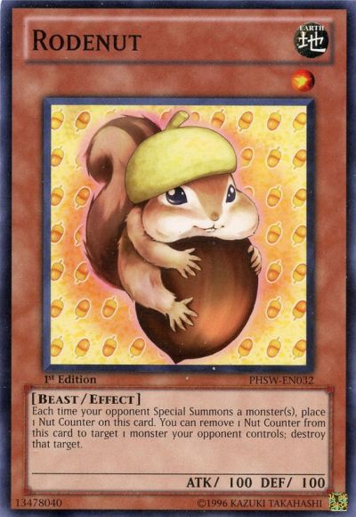 Each time your opponent Special Summons a monster(s), place 1 Nut Counter on this card. You can remove 1 Nut Counter from this card to target 1 monster your opponent controls; destroy that target.