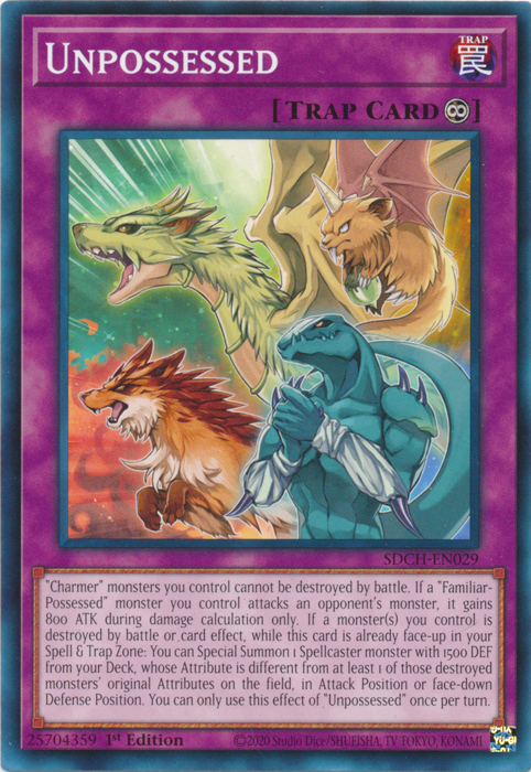 "Charmer" monsters you control cannot be destroyed by battle. If a "Familiar-Possessed" monster you control attacks an opponent's monster, it gains 800 ATK during damage calculation only. If a monster(s) you control is destroyed by battle or card effect, while this card is already face-up in your Spell & Trap Zone: You can Special Summon 1 Spellcaster monster with 1500 DEF from your Deck, whose Attribute is different from at least 1 of those destroyed monsters' original Attributes on the field, in Attack Position or face-down Defense Position. You can only use this effect of "Unpossessed" once per turn.