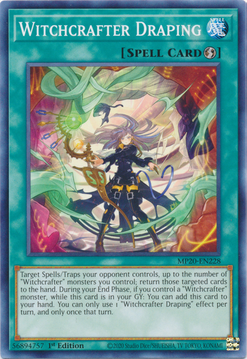 Target Spells/Traps your opponent controls, up to the number of "Witchcrafter" monsters you control; return those targeted cards to the hand. During your End Phase, if you control a "Witchcrafter" monster, while this card is in your GY: You can add this card to your hand. You can only use 1 "Witchcrafter Draping" effect per turn, and only once that turn.